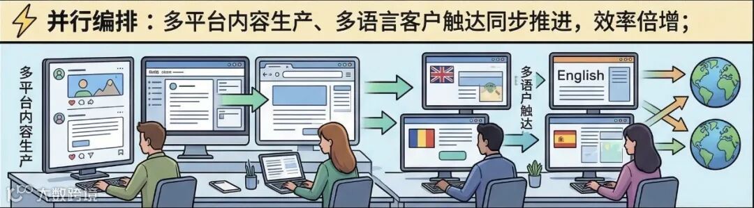 并行处理:多平台内容生产、多语言客户触达同步推进,效率倍增。