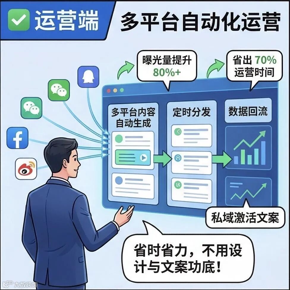 运营端:多平台内容自动生成、定时分发、数据回流,曝光量显著提升,节省大量运营时间,私域激活文案按需产出,无需专业设计与文案功底。