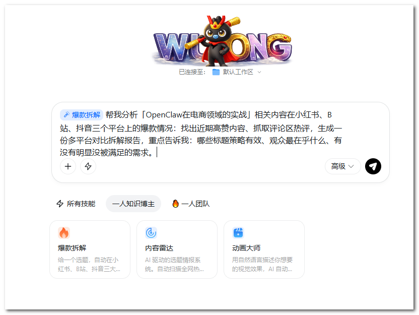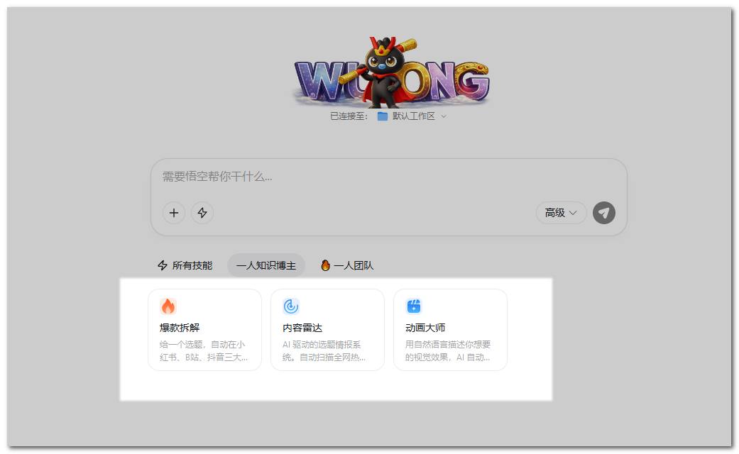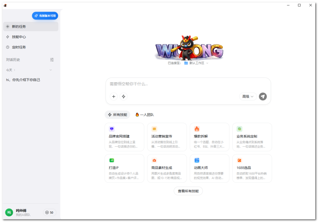 悟空的“一人团队”概念根据业务场景推荐和组合优质 Skills,开箱即用,降低了寻找和安装技能的成本。