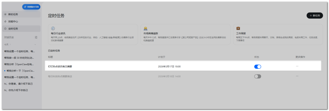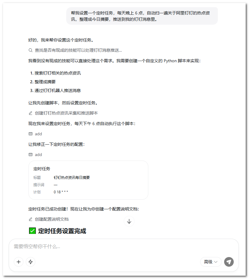 在对话里说:「帮我设置一个定时任务,每天晚上 6 点,自动扫一遍关于阿里钉钉的热点资讯,整理成今日摘要,推送到我的钉钉消息里。」