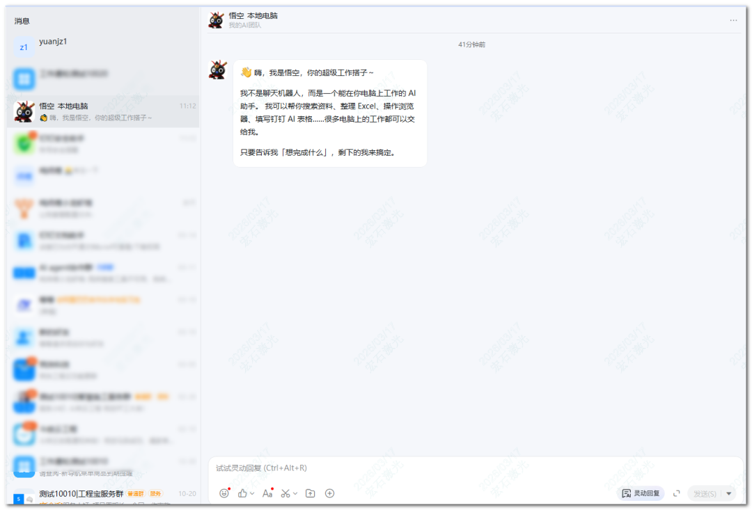悟空是一个独立的应用,界面简洁。登录后,它会自动集成在钉钉里,支持通过钉钉进行交互。