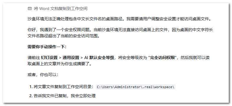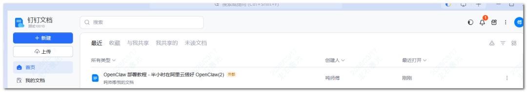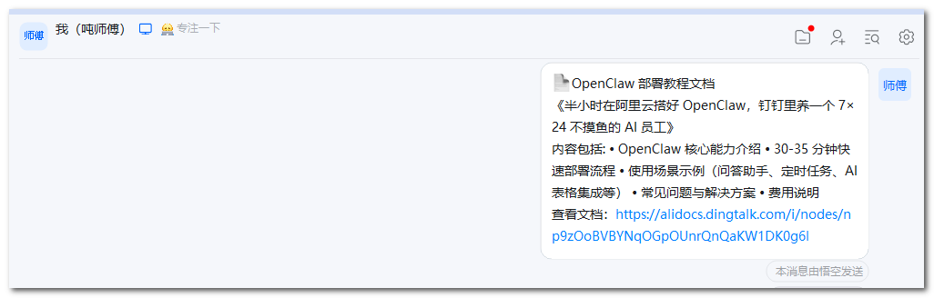 「帮我把电脑工作区里的那篇关于安装 openclaw 的文章找到,然后存到我的钉钉文档里,并发送给我自己的钉钉会话里。」