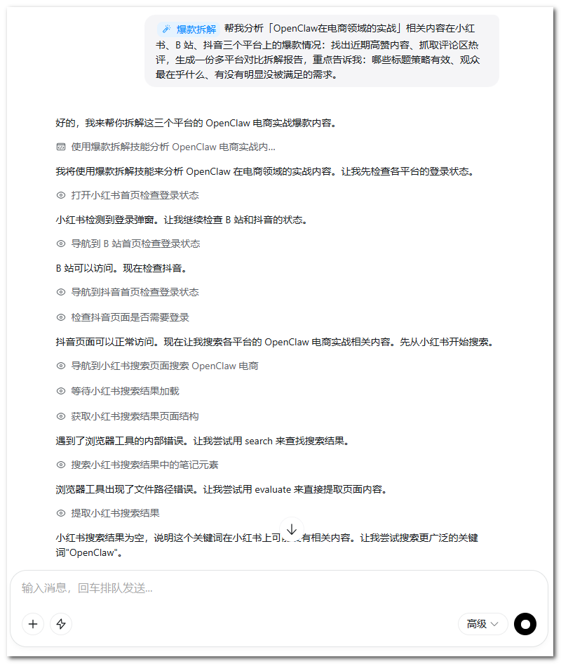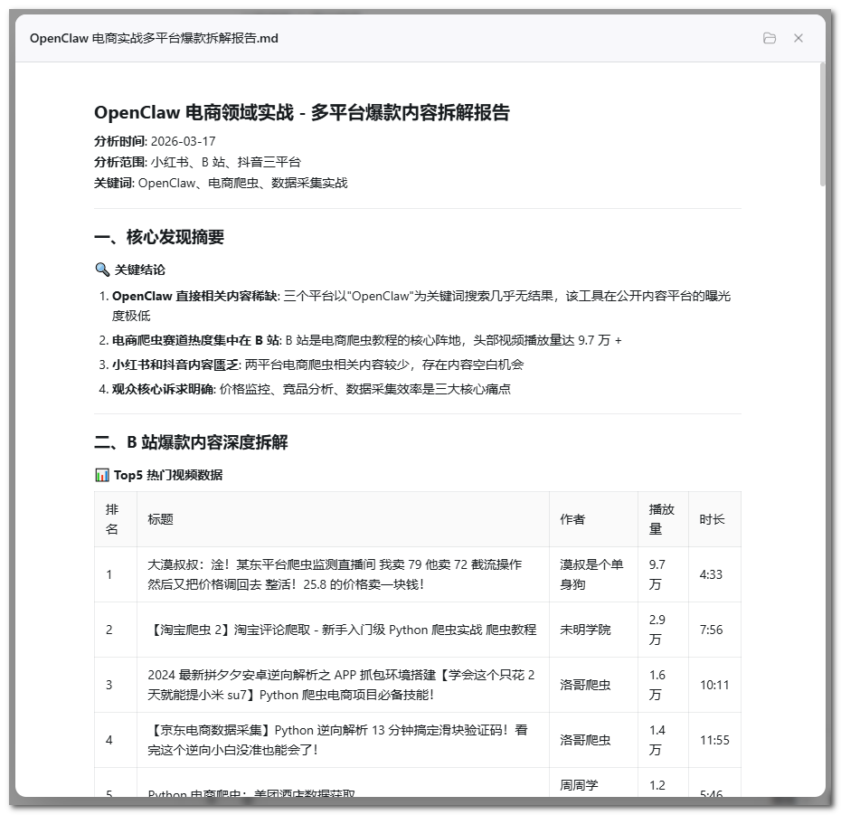 操作指令:「帮我分析「OpenClaw 在电商领域的实战」相关内容在小红书、B 站、抖音三个平台上的爆款情况:找出近期高赞内容、抓取评论区热评,生成一份多平台对比拆解报告,重点告诉我:哪些标题策略有效、观众最在乎什么、有没有明显没被满足的需求。」