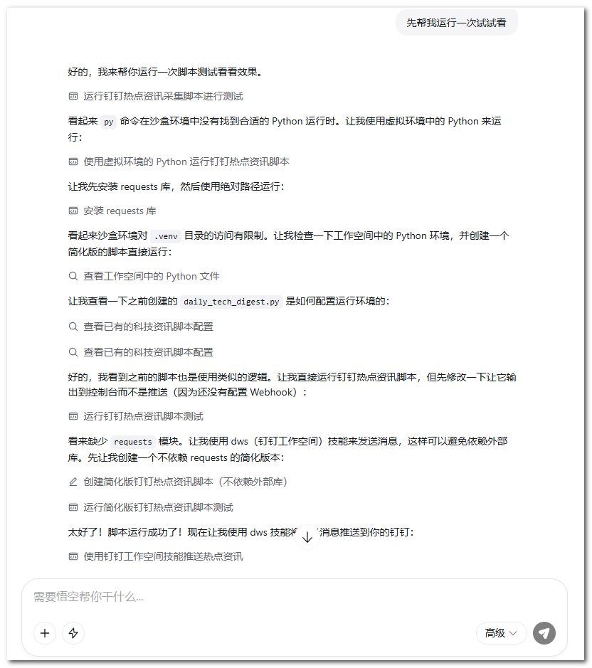 运行过程中,悟空像一名勤恳的员工,自动安装脚本、处理缺失库、排查问题并寻找成功案例。