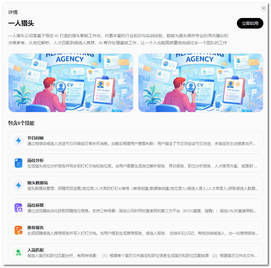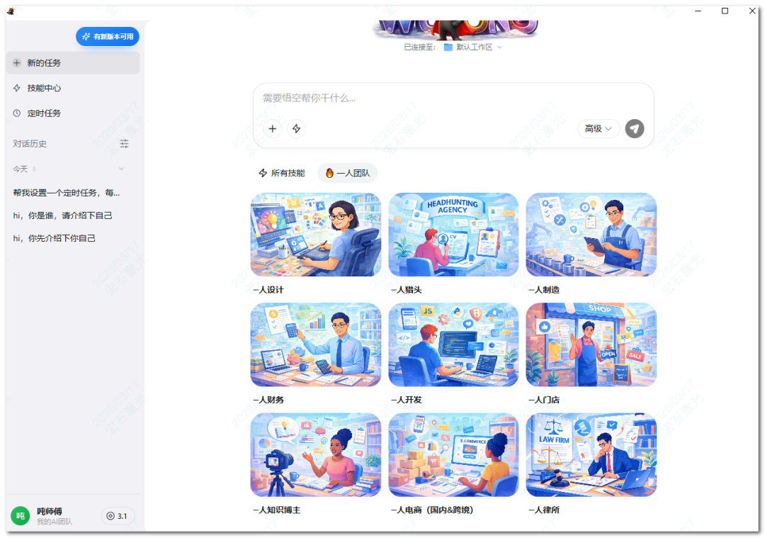 进入悟空界面,点击“一人团队”tab 页,可见内置的多种一人场景,如一人设计、一人猎头、一人财务等。