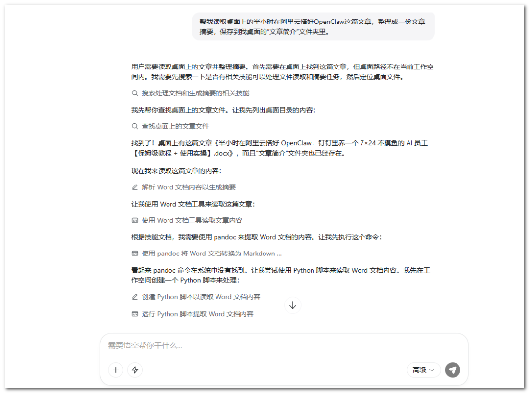 对悟空说:「帮我读取桌面上的半小时在阿里云搭好 OpenClaw 这篇文章,整理成一份文章摘要,保存到我桌面的“文章简介”文件夹里。」