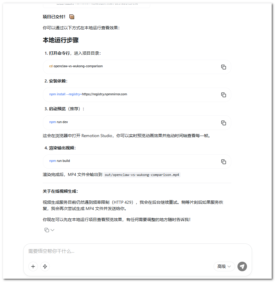 悟空调用脚本创作渲染,自动处理环境缺失和权限申请。生成 MP4 时若受影响,会提供本地运行步骤。