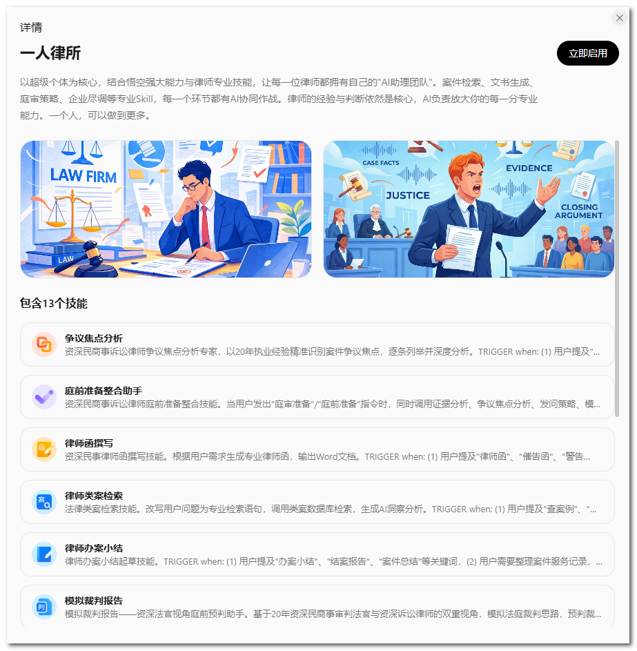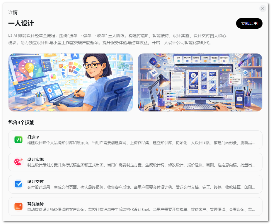 以“一人知识博主”为例,启用后单独创建 tab,显示相关 Skills。