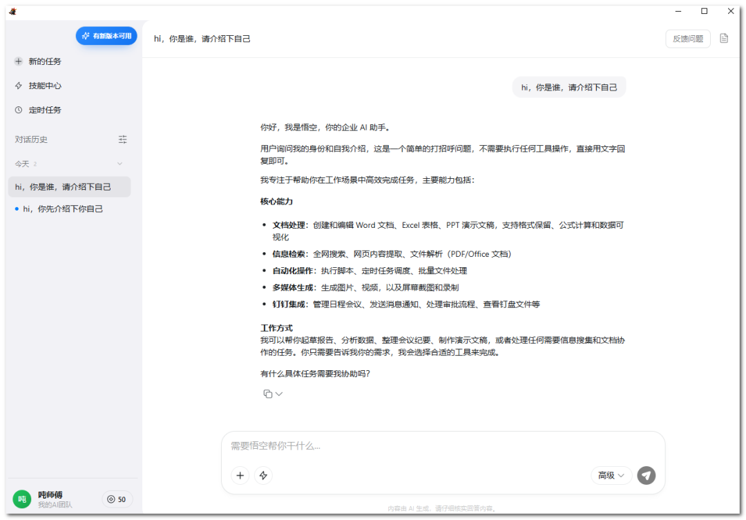 页面功能包括新建任务、安装技能、设置定时任务等。通过自我介绍功能,可以看到其回答简洁明了。