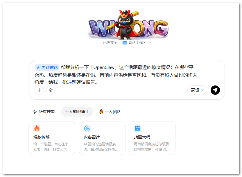 这三个 Skill 分别是:内容雷达、爆款拆解、动画大师。以下以「OpenClaw」为选题进行全流程实测。