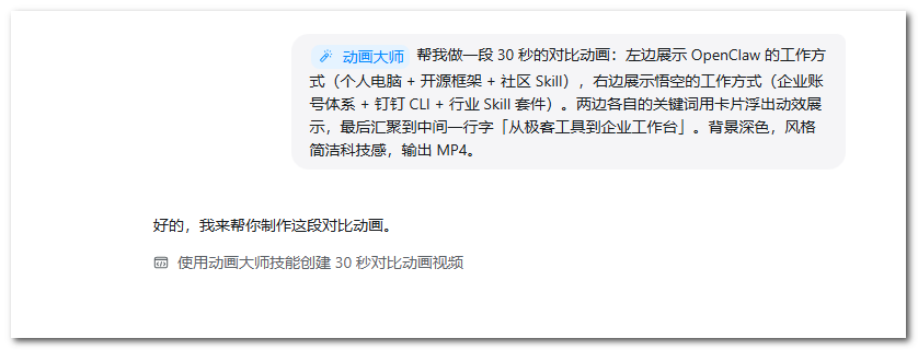 为展示"OpenClaw 是极客玩具,悟空是企业工具”的论点,需制作动态对比图。操作指令:「帮我做一段 30 秒的对比动画:左边展示 OpenClaw 的工作方式,右边展示悟空的工作方式。两边各自的关键词用卡片浮出动效展示,最后汇聚到中间一行字「从极客工具到企业工作台」。背景深色,风格简洁科技感,输出 MP4。」