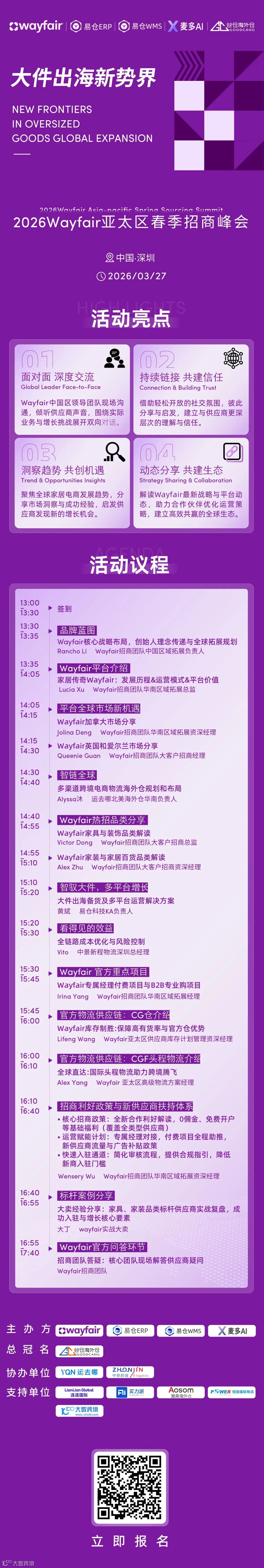 活动特别适合从事家居、家纺等大件品类出海的卖家,以及正在关注 Wayfair 新市场机会的企业参与。