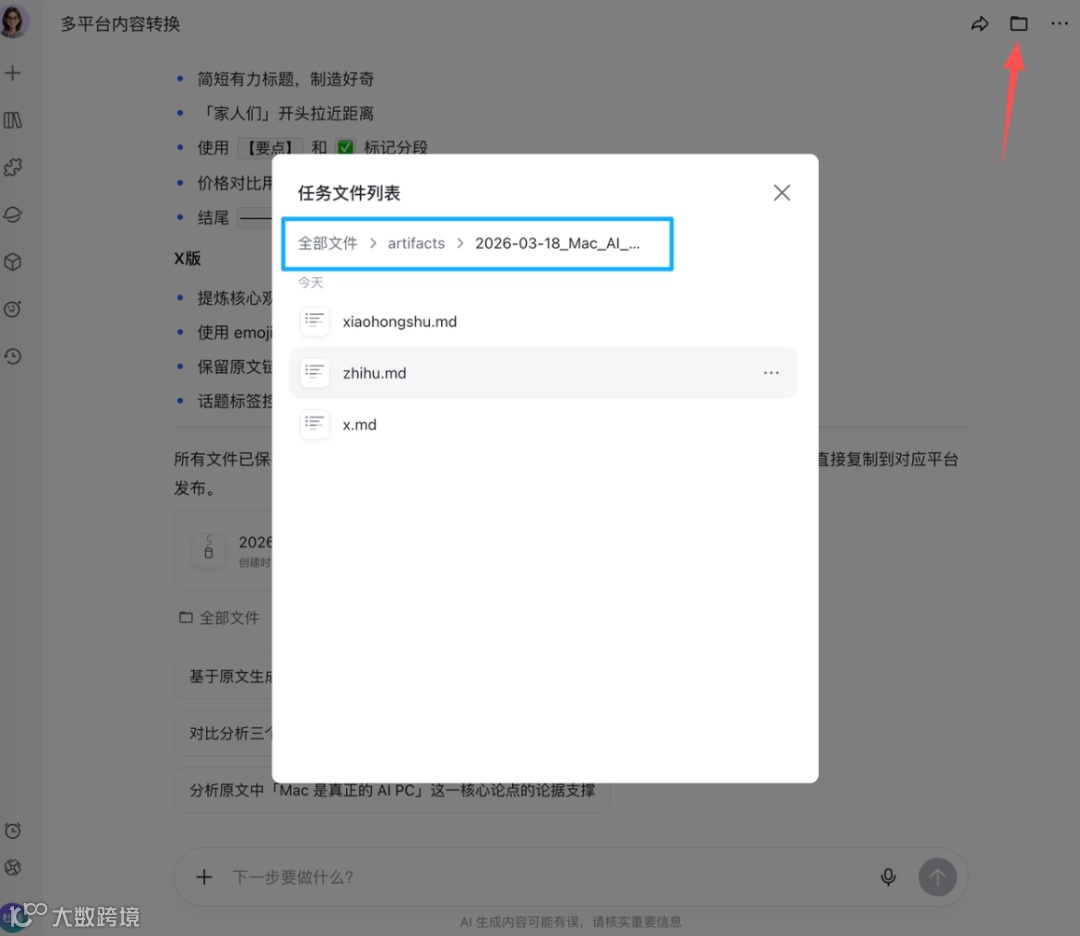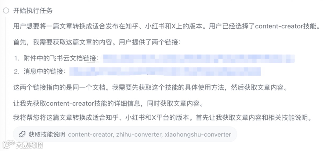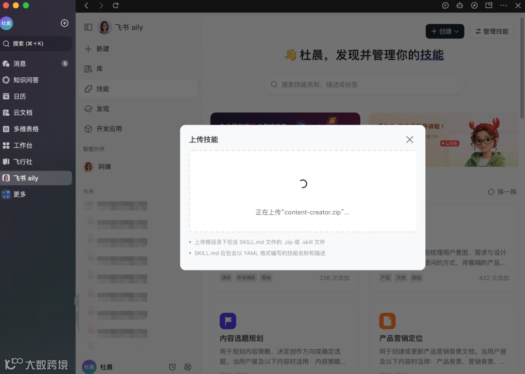 针对深度报道文章生成浅显易懂的社媒版本,适合使用飞书 aily 专业版。其图形界面支持精细化输入调整,便于调用原生工具与插件。通过搜索或访问 aily.feishu.cn 即可进入专业版,支持上传自定义 Skill,如「content-creator」。