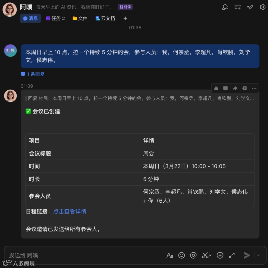 飞书 aily 可直接查询组织架构内用户 ID,得益于统一权限机制。确认为与时问后调用日历技能即可建会。全程约半分钟,实现指令即达。
