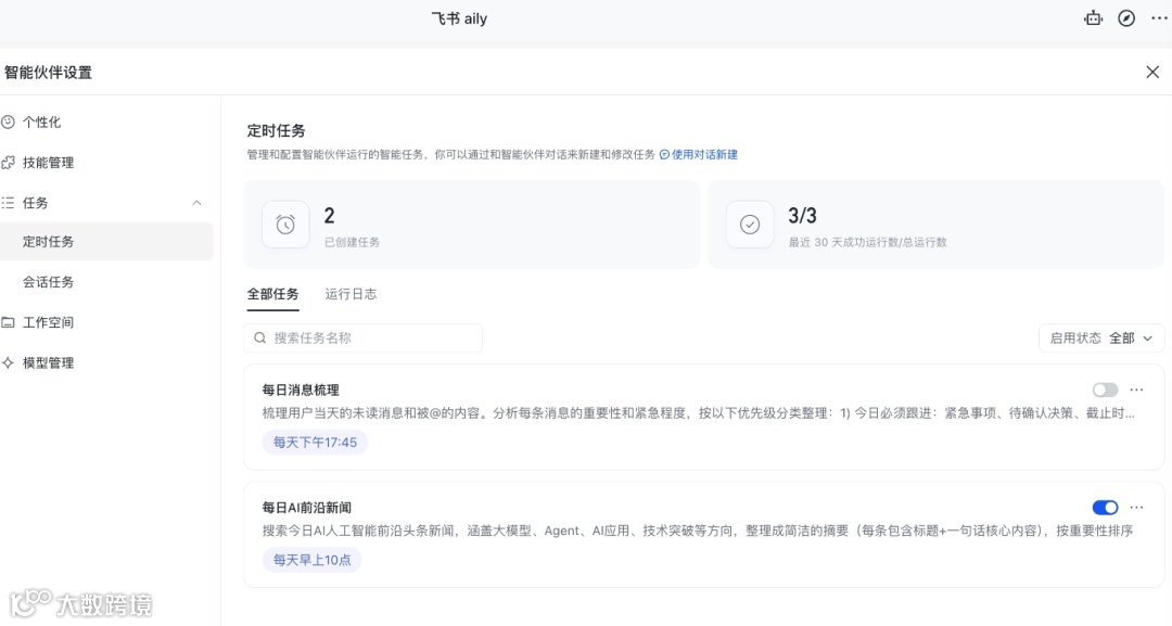 飞书 aily 支持定时任务创建,交互体验优于 OpenClaw。