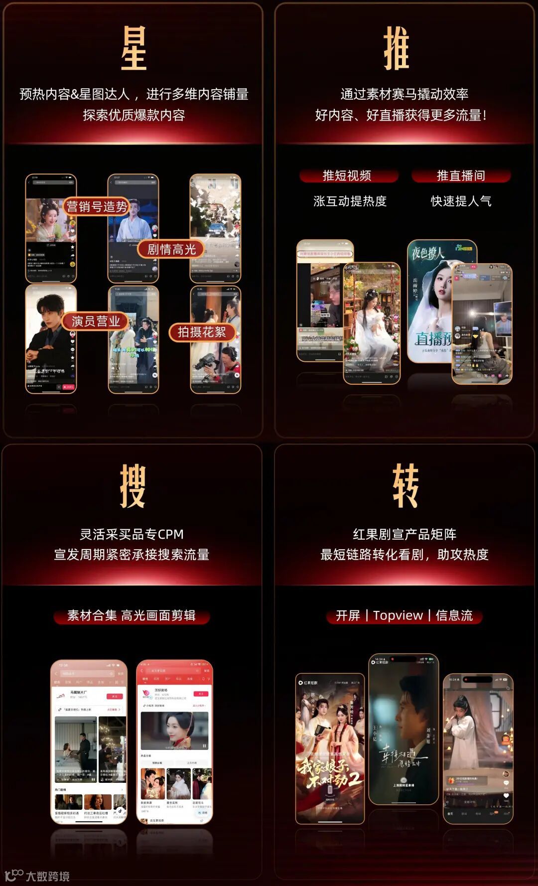 围绕这一链路,平台沉淀出"星 - 推 - 搜 - 转"成熟剧宣打法,强调多平台资源联动、多节点营销协同,推动短剧营销从粗放投流向体系化运营进阶。