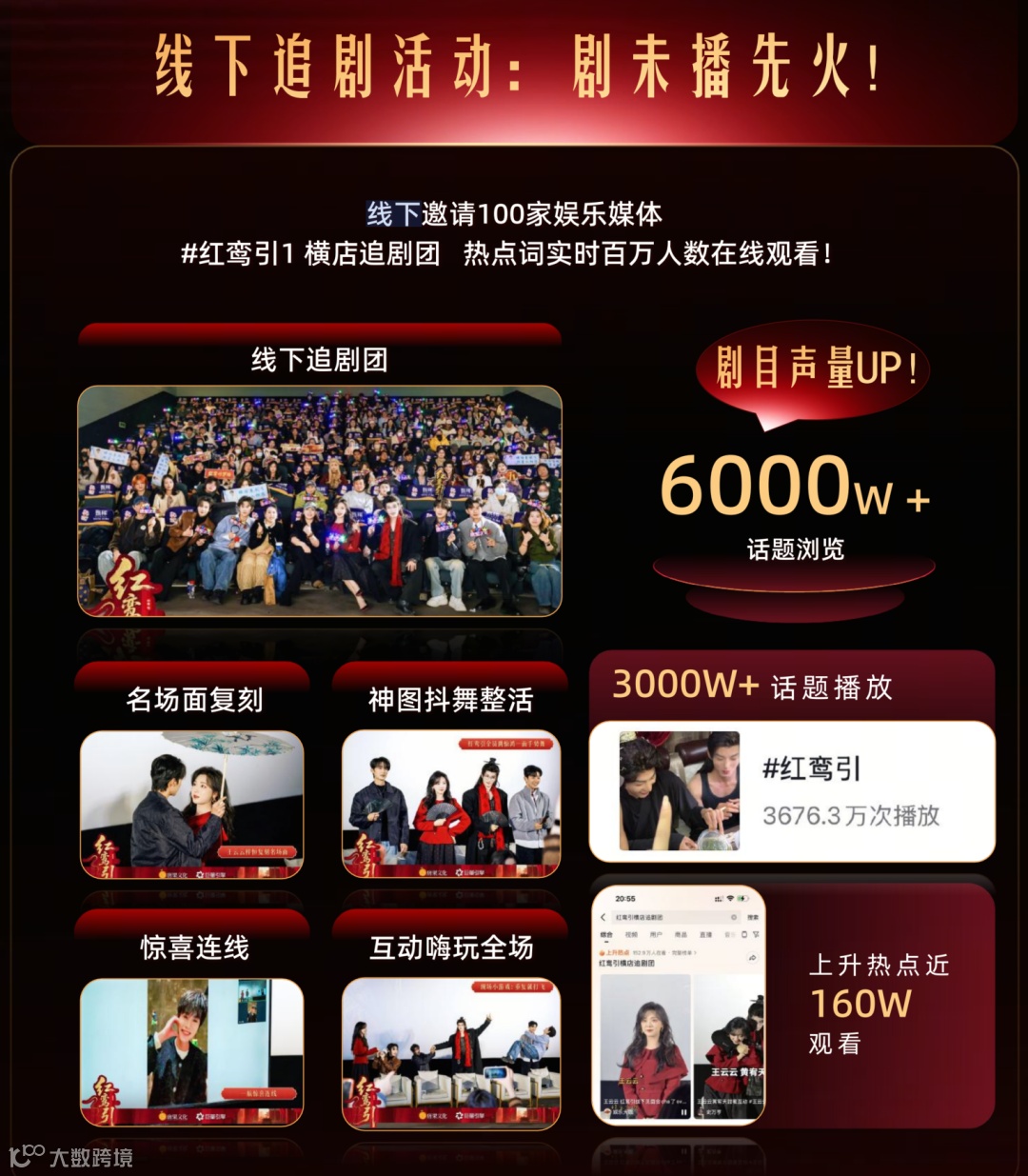 《红鸾引》在上线前通过横店线下追剧团联动百家媒体,实现"剧未播先热",带动热点词实时聚集百万人在线观看,单项目声量增长达 6000 万,显著放大了内容的首发势能。