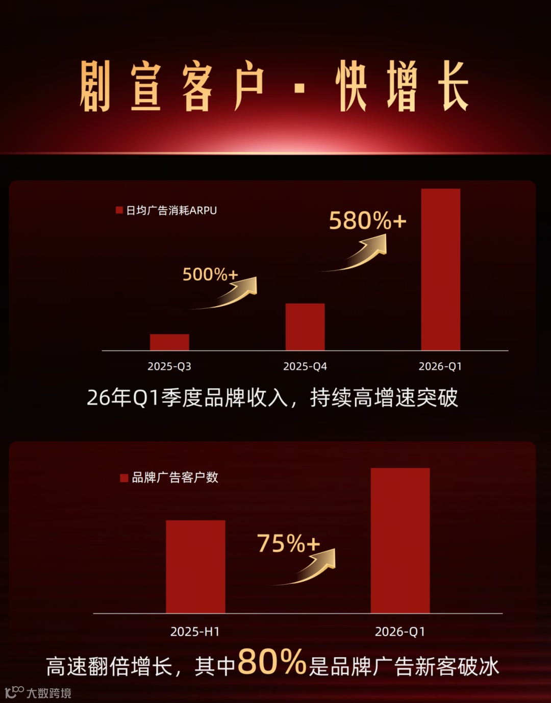 剧宣客户的快速增长印证了市场信心:2026 年 Q1 季度品牌收入持续高速增长,日均广告消耗 ARPU 平均增速高达 580%,品牌广告客户数翻倍增长,其中 80% 以上是品牌广告新客破冰。短剧品宣正从"加分项",演变为行业发展的"核心基础设施"。
