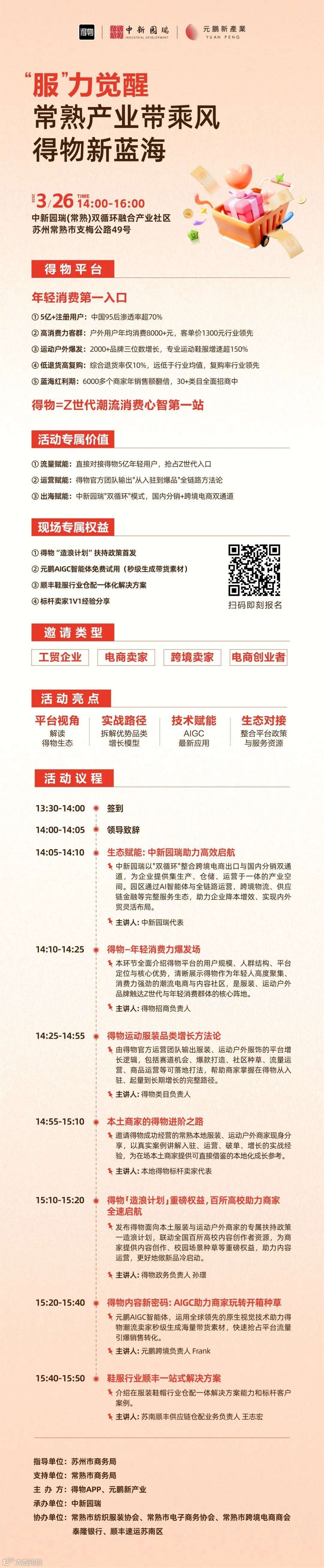3 月 26 日,一场聚焦潮流服饰电商前沿的主题交流活动将在中新园瑞(常熟)双循环融合产业社区举行。本次活动由苏州市商务局指导,常熟市商务局支持,苏州元鹏新产业投资有限公司联合得物 APP 平台共同策划,中新园瑞承办,旨在为本地企业搭建优质资源对接桥梁,提供专业运营指导与扶持,助力传统服装企业向数字化、品牌化、时尚化方向转型升级。