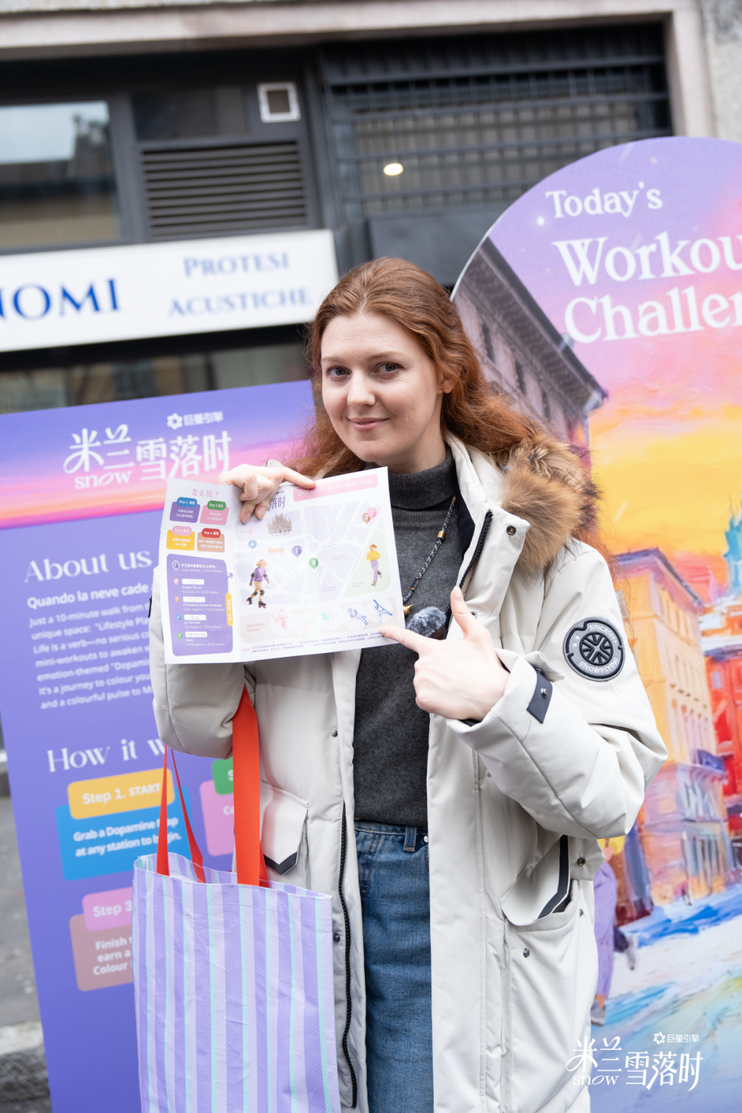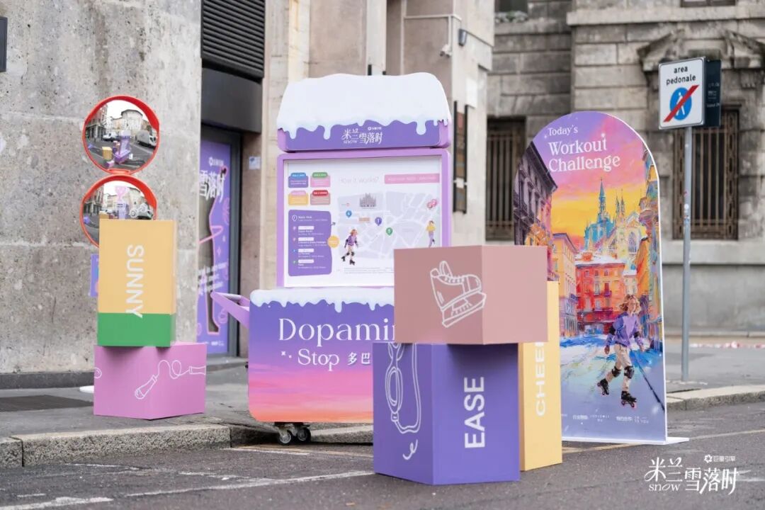 2 月 7日至 9 日,米兰大教堂周边 10 分钟步行区被染上“多巴胺色彩”。用户手持“多巴胺寻路图”,在五大站点通过完成伸展、快走、摸高等 10-30 秒轻运动动作,收集彩色 Pin 兑换礼品。这一设计诠释了“生活是个动词”的要旨:动作不必宏大,关键在于让身体和心情“动”起来。一路的小色块、小动作,为冬日低饱和的米兰街头增添了活力色彩。