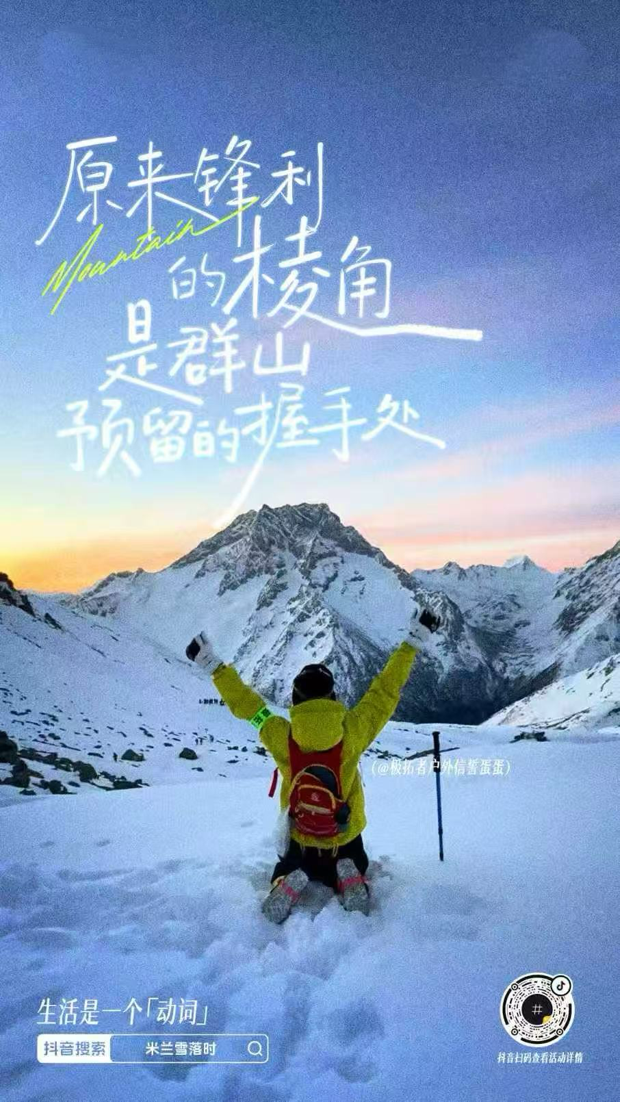 在 IP 核心主张下,情绪短片与海报如同发令枪,让“生活是个动词”落地为千万种具体的心跳。数百位用户的真实生活瞬间——雪中滑行的自在、达成挑战后的沸腾、专注于热爱的眼神,共同拼贴出“动词”生活的鲜活样貌。冰雪运动与生活哲思巧妙缝合,“滑雪的浪漫,是雪不说话,它只接住我”、“原来锋利的棱角,是群山预留的握手处”……如同散落的诗笺,赋予运动以美学与情感。