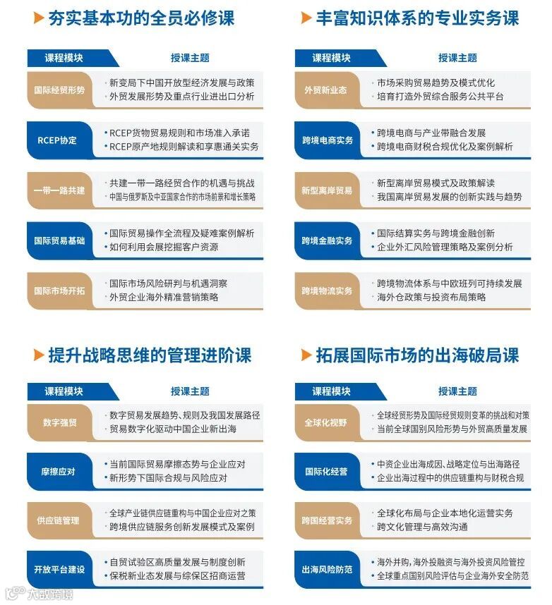 为此,我们在历经五年倾力打造的「外经贸大讲堂系列培训」的基础上,不断精心打磨,特别推出了2026年国际贸易与企业出海实战课程体系。重点聚焦政策形势与出海趋势、区域国别市场分析、RCEP产业布局、一带一路经贸合作、国际贸易实操、海外市场开拓、跨国经营管理、数字贸易与跨境电商、外贸新业态新模式、贸易便利化及保税业态等内容,构建企业对外经贸的全景认知图谱,通过解读政策红利、明晰海外布局、拆解出海策略,帮助企业有效解决跨境出海过程中"政策难吃透、流程理不清、风险不可控"的核心痛点,为制定企业全球化发展策略提供重要参考。