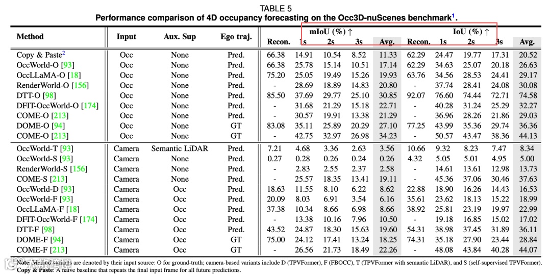 表5:Occ3D-nuScenes 4D Occupancy 预测(对应论文 Table 5)