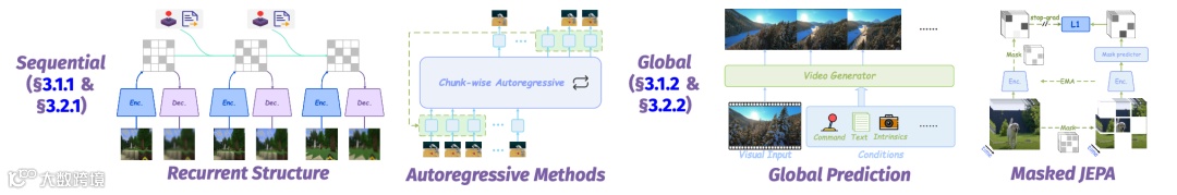 2、时间推理,区分了两种不同的预测范式。序列仿真与推断模型以自回归的方式模拟动态过程,逐步展开未来状态。相比之下,全局差异预测直接并行估计整个未来状态,虽然效率更高,但可能以降低时间一致性为代价。