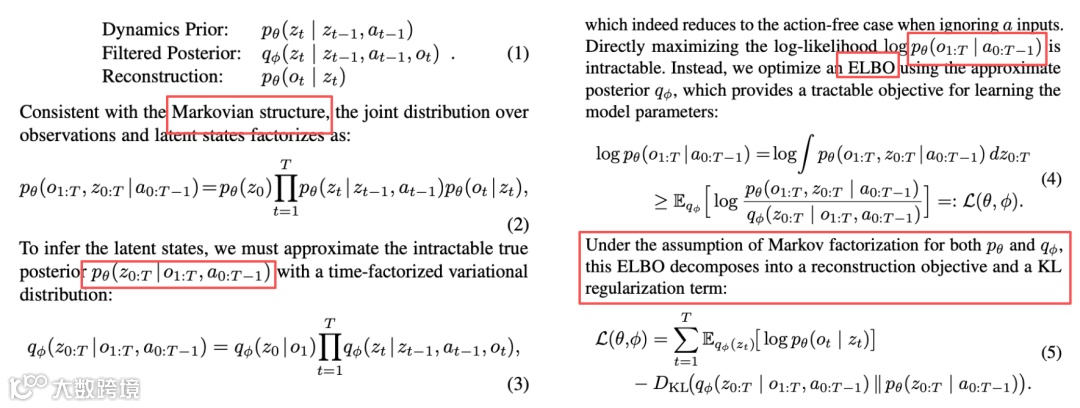 因 此,现代世界模型采用重构-正则化训练范式: 似然项促进观测的忠实预测,KL正则化项则使过滤后的后验 与动态先验对齐。