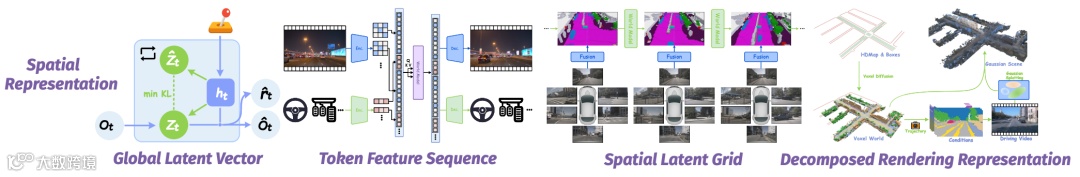 空间潜在网格:表示通过利用几何先验(如鸟瞰图(BEV)特征或体素网格)将空间归纳偏置融入世界模型中。 -