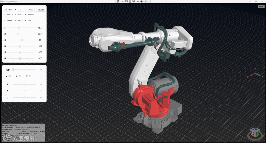 使用 HelixToolkit 渲染高质量的机械臂 3D 模型,支持视角旋转、平移、缩放。