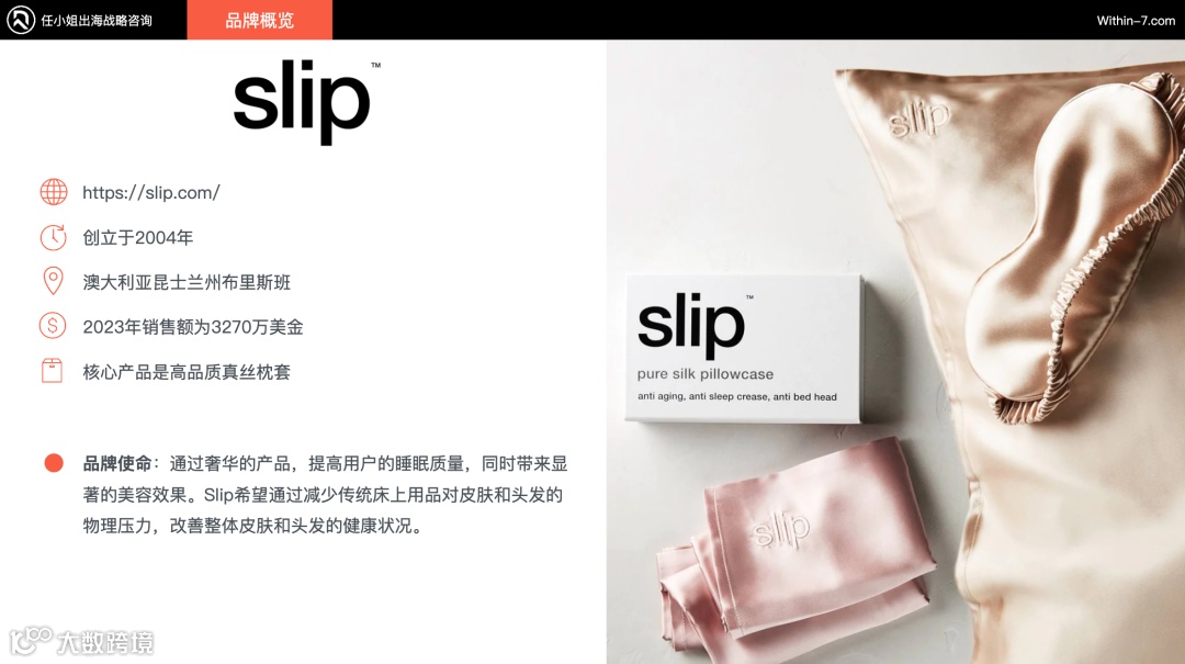 我们会挑选优质案例在公众号分享讲解。本次案例是高品质真丝枕套品牌Slip,2023年销售额为3270万美金,客单价区间为$89到$110。
