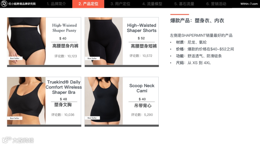 Shpaermint的核心产品是塑身衣(塑身短裤、塑身内裤、塑身内衣、塑身连体衣等),品牌主打塑身的同时很舒适、有弹性、不易滑落,不影响做其他事情。产品描述词:“Daily Comfort”。