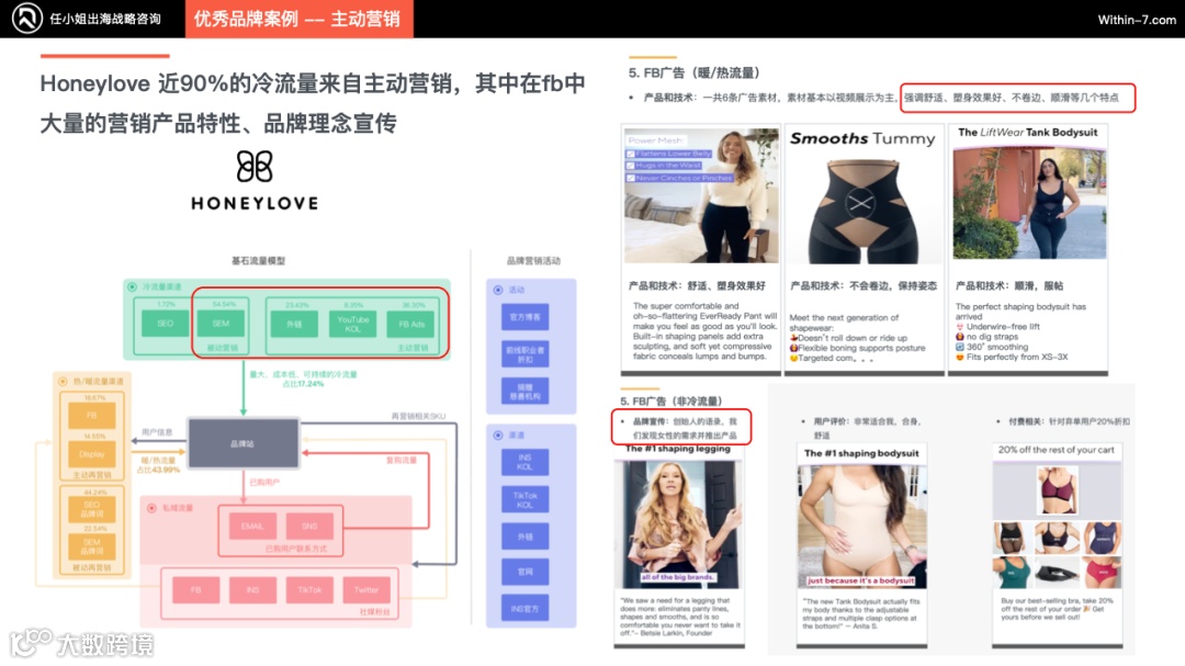 Honeylove 近90%的冷流量来自主动营销,其中在fb中设置了大量的营销产品特性、品牌理念宣传。