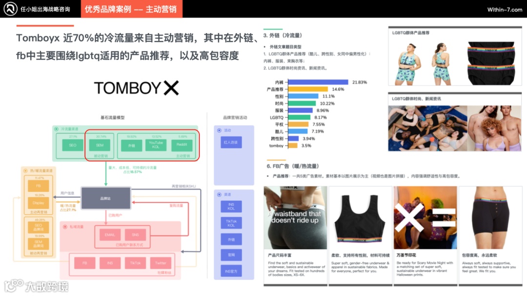 Tomboyx 近70%的冷流量来自主动营销,其中在外链、fb中主要围绕LGBTQ适用的产品推荐,以及高包容度。