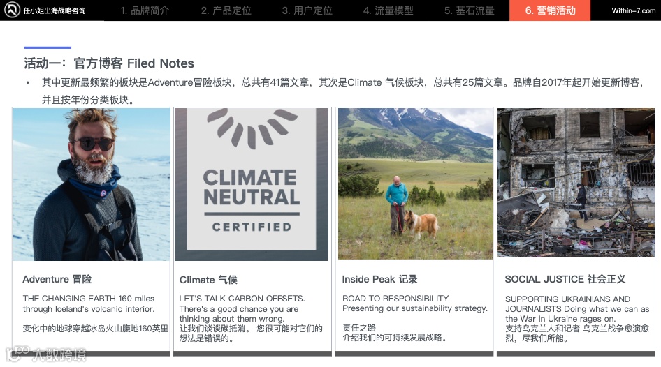 官方博客一共7个主题,分别是冒险、气候、众筹101、生活方式、社会正义、记录。目的就是为了增强品牌在摄影方面的专业度,突出企业的社会责任感。