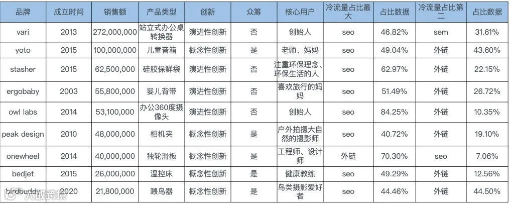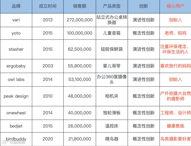 下表对9个优秀创新型品牌进行了总结,其中很多概念性创新品牌选择产品正式售卖前在Kickstarter等平台进行众筹,给产品做市场验证的同时为品牌带来一定声量。概念性创新型品牌在之前的市场中并不存在,更需要通过大流量的平台去做市场验证和推广。