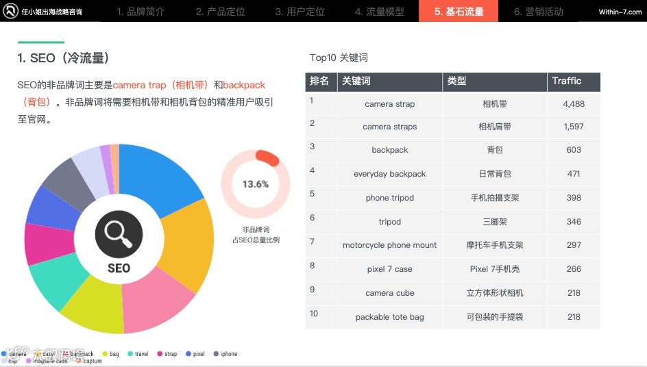 品牌核心产品为一个创新型的相机夹,所以产品不被大众所熟知。品牌优先提高SEO非品牌词流量和外链。