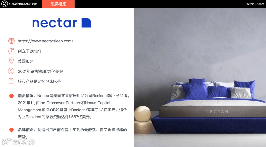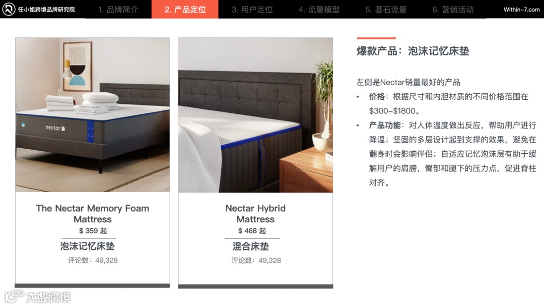 相比于其他床垫品牌Casper和Purple,他们的产品单价需要$1,500-$2,000,而Nectar的价格仅需他们的一半($300-$1800),所以品牌的目标是制造出用户能在网上买到的最舒适、但又负担得起的床垫。