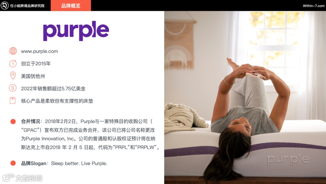 Purple是创立于 2015 年,来自于美国的犹他州,那它 2022 年的销售额是超过了 5.75 亿美金,它的核心产品就是柔软但是有支撑性的床垫。