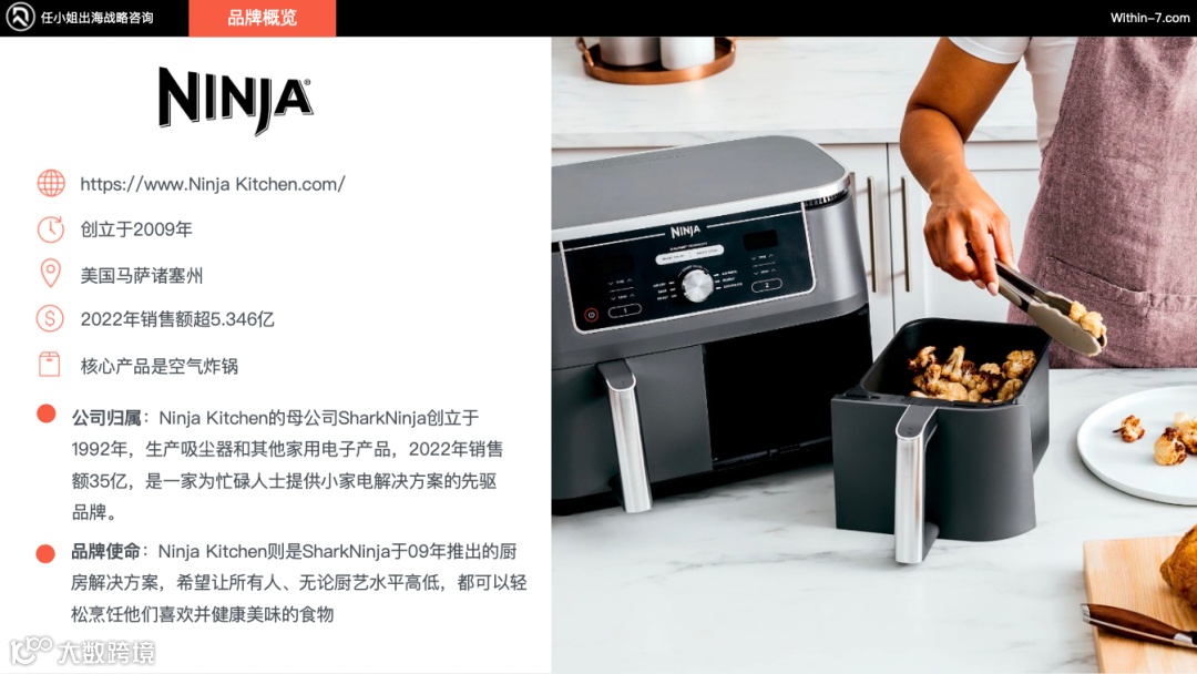 Ninja Kitchen创立于2009年,来自于美国马萨诸塞州,那它 2022 年的销售额是超过了5.346亿美金,它的核心产品就是空气炸锅。