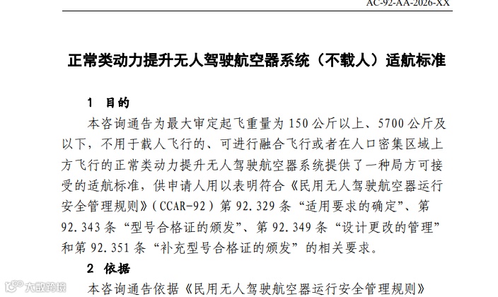 十五五开年,国内低空经济发展按下“加速键”,民航局持续加码行业标准制定!2月25日,民航局适航司正式发布《正常类多旋翼无人驾驶航空器系统(不载人)适航标准(征求意见稿)》和《正常类动力提升无人驾驶航空器系统(不载人)适航标准(征求意见稿)》两份重磅文件。