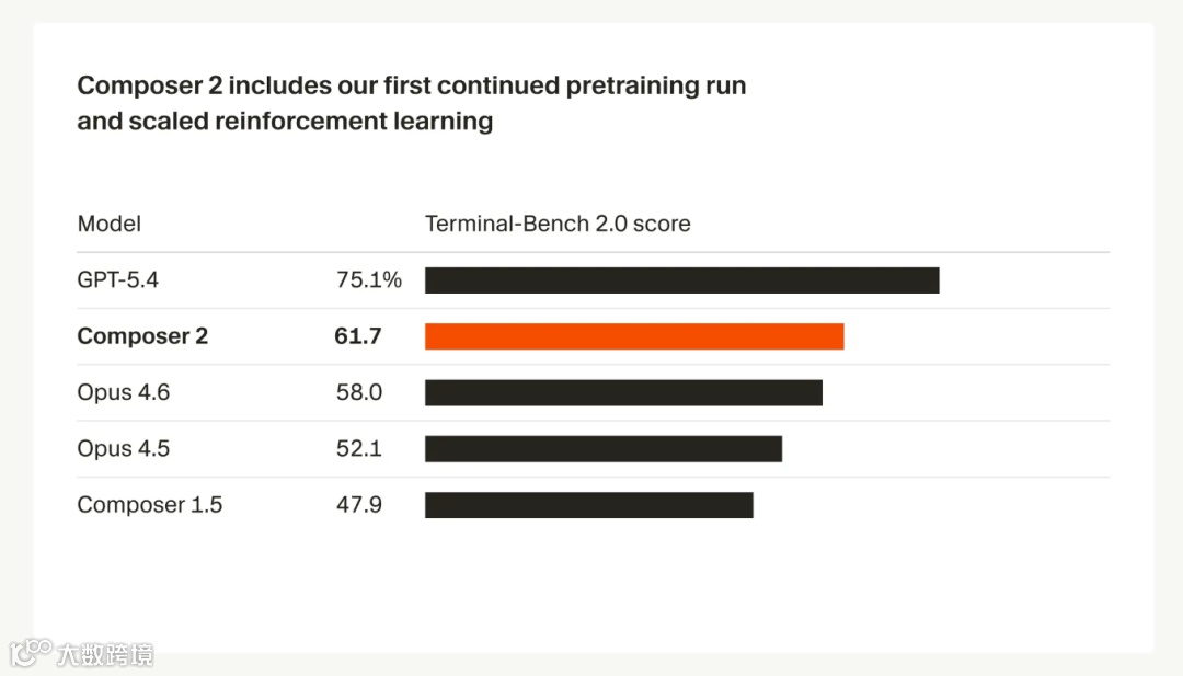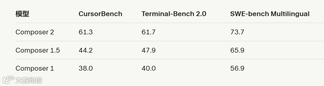 已上线的Composer 2聚焦编程领域性价比提升。在Terminal-Bench 2.0和SWE-bench Multilingual等基准测试中,其性能居于GPT-5.4与Claude Opus 4.6之间。