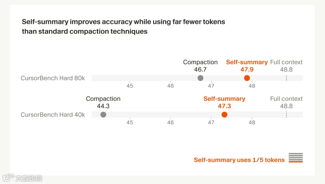 传统方案依赖上下文压缩技术,易导致关键信息丢失。而Cursor采用自我总结机制:模型在固定token长度触发点暂停,主动生成上下文摘要,将关键信息传递至后续步骤。
