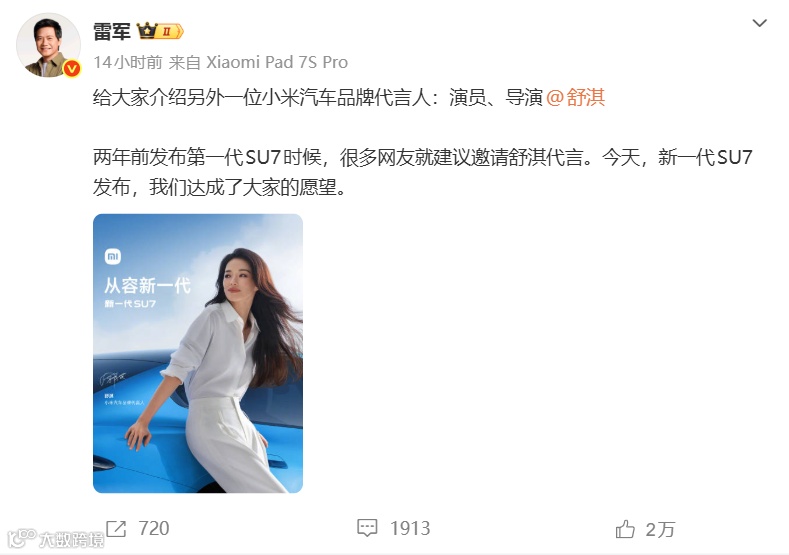 3月19日,小米汽车正式宣布演员舒淇成为品牌代言人,实现用户长期期待。雷军表示,该合作达成网友两年来对SU7代言人的愿望。