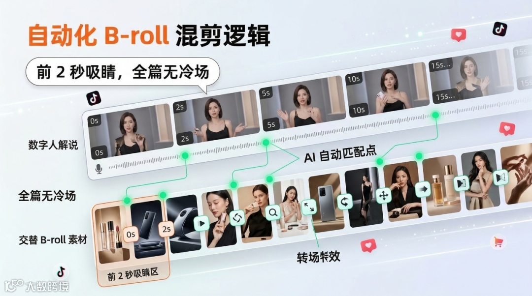 1.在 TikTok 运营中,前 2 秒的黄金留存率是影响视频进入流量池的关键因素,单调的数字人讲解容易导致用户流失。CapCut 的智能混剪与 AI 素材匹配功能,可以根据脚本关键词,自动匹配并插入你上传至素材箱的产品实拍 B-roll 素材。例如当数字人提到 “它非常耐用” 时,系统可自动切入产品抗压测试的特写画面,通过 “主述 + 空镜” 的组合,提升视频信息密度与完播率(VTR),是跨境电商短视频的高效运营手段。