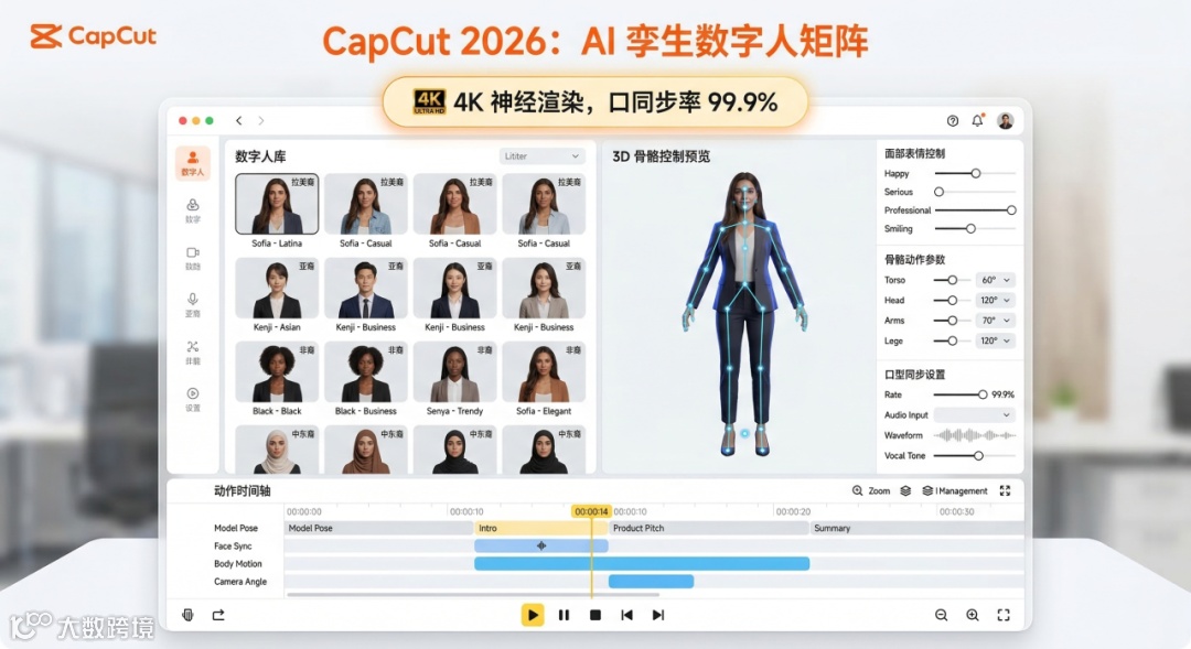 在 2026 年的 TikTok Shop 美区战场,“纯搬运”已经彻底死亡。随着平台 AI 识别算法的迭代,非原创视频的流量权重已被下调 80% 以上。然而,对于大多数中国卖家而言,高昂的外籍模特录制成本(单条 $200+)依然是沉重的负担。近期,CapCut(剪映专业版) 2026 旗舰版的发布,其内置的“AI 孪生数字人”与“多语种声纹克隆”技术,让卖家仅需输入脚本,即可生成 0 破绽的本土化带货视频。本文将手把手带你掌握这套“一人分饰千人”的极速产出流。