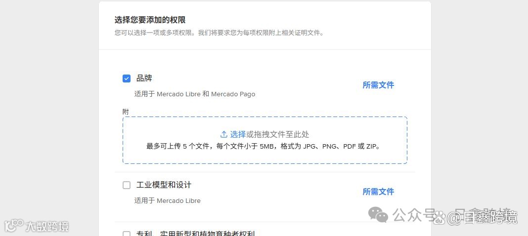 勾选需注册的权利类型,核心选择Brand(同时适用于Mercado Libre平台及Mercado Pago支付渠道),可根据需求勾选多个权利类型。