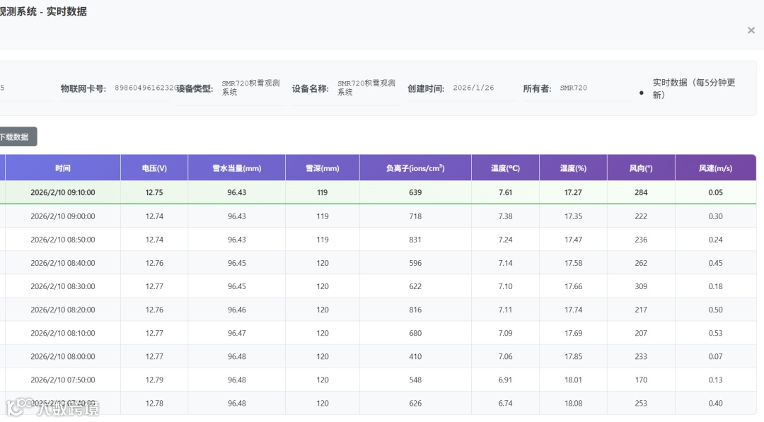 2026年1月底我司为某滑雪场架设了一套积雪自动观测系统。该系统可对场区关键气象与环境指标进行实时、连续监测,为雪场运营、雪道维护及游客体验提供科学数据支撑。该系统可实时采集多项关键数据,主要包括:雪深、雪水当量(降水量),风速、风向、空气温度、空气湿度,负氧离子浓度等。
