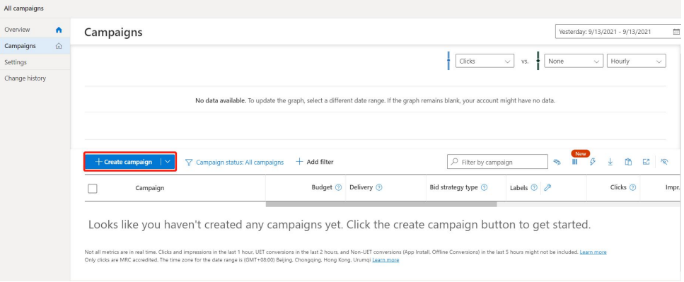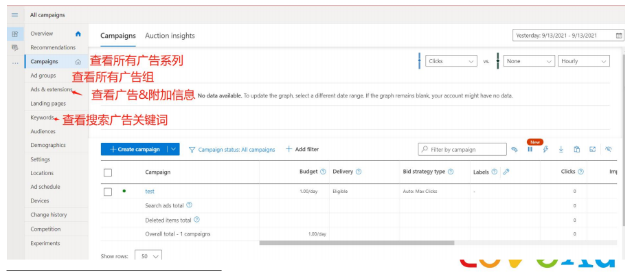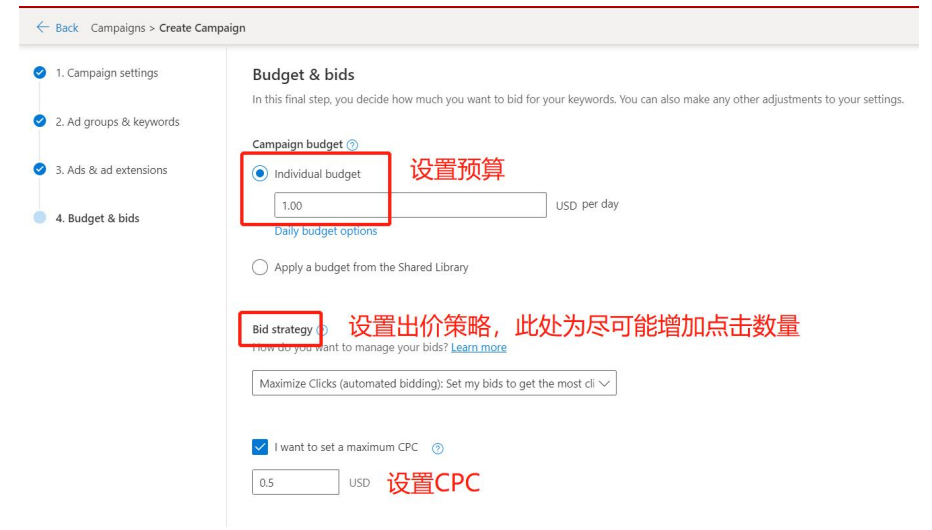 Step 8、设置预算、出价策略or CPC,设置好后点击保存,页面跳转回Bing ads概览